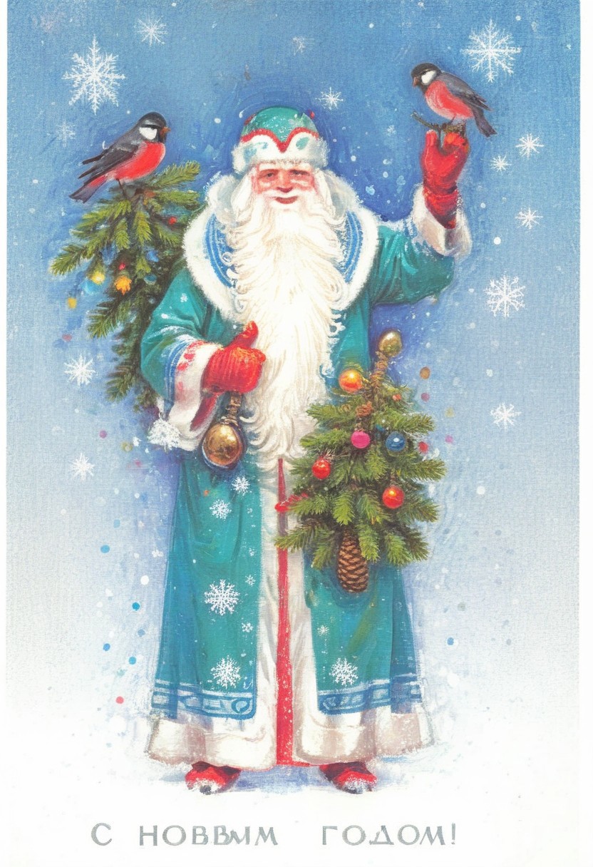 father frost, DedMoroz, postcard,,bird,white background,winter, scifi, shade of deepblue,darkgreen, soviet new year postcard, (s novym godom logo:1.2), <lora:mgl_Soviet_New_Year_Postcards:0.85>, landscape, winter, cosmos,dusk,forest,