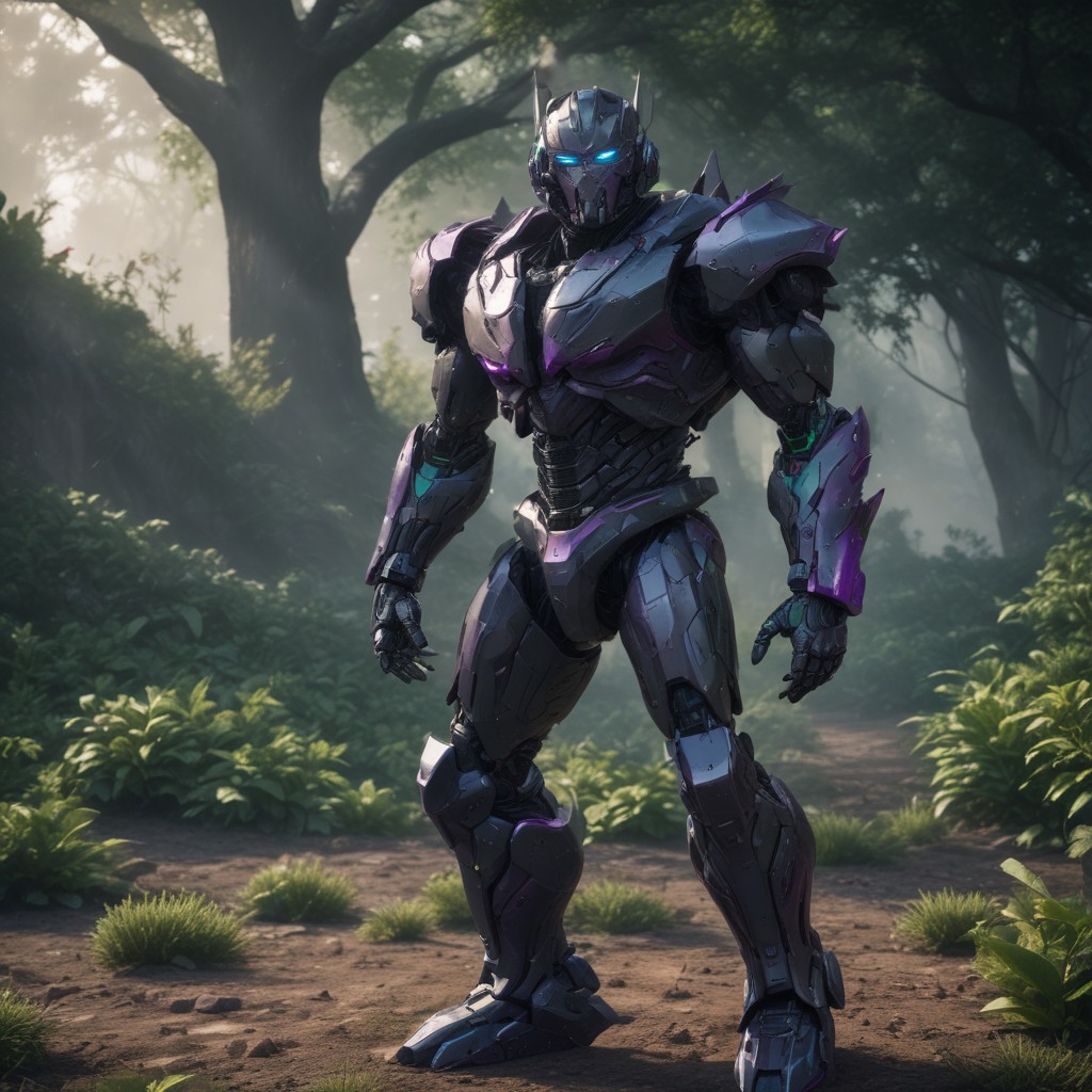 Create a cinematic 3D rendering of a man from the Transformers universe standing in a mystical 'Black Garden' environment. The scene should have a dominant purple and green color scheme. Ensure the man wears dark visors, and his proportions are accurate. Incorporate micro details such as bugs and a connector with green lines. Utilize strong rim light, reflections, and a mix of soft and strong shadows to create depth. The image should be in 8K resolution, reminiscent of 90s aesthetics, and have a strong, unmasked central figure. The output should be in the style of a high-end 3D render, similar to those trending on ArtStation, and compatible with Octane or Vray rendering.