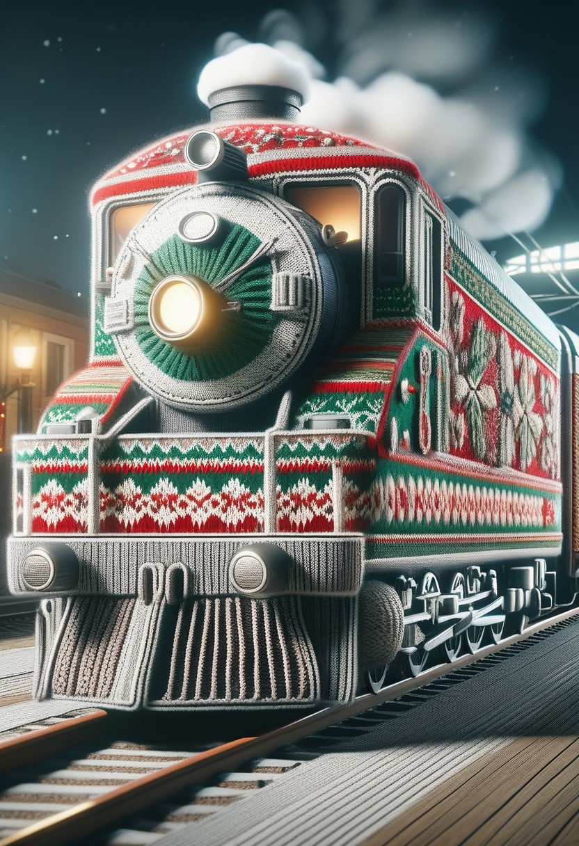 wide angle shot, detailed realistic photo, ChristmasSweater, a Christmas Steam Locomotive with Santa's train transformed into a festive knitted Christmas sweater design, parked in front of a decorated railstation, cinematic lighting