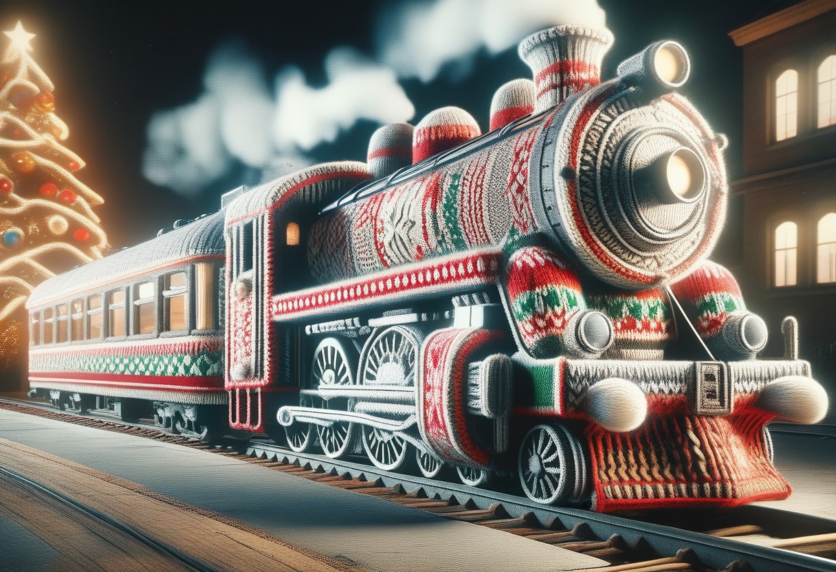 wide angle shot, detailed realistic photo, ChristmasSweater, a Christmas Steam Locomotive with Santa's train transformed into a festive knitted Christmas sweater design, parked in front of a decorated railstation, cinematic lighting