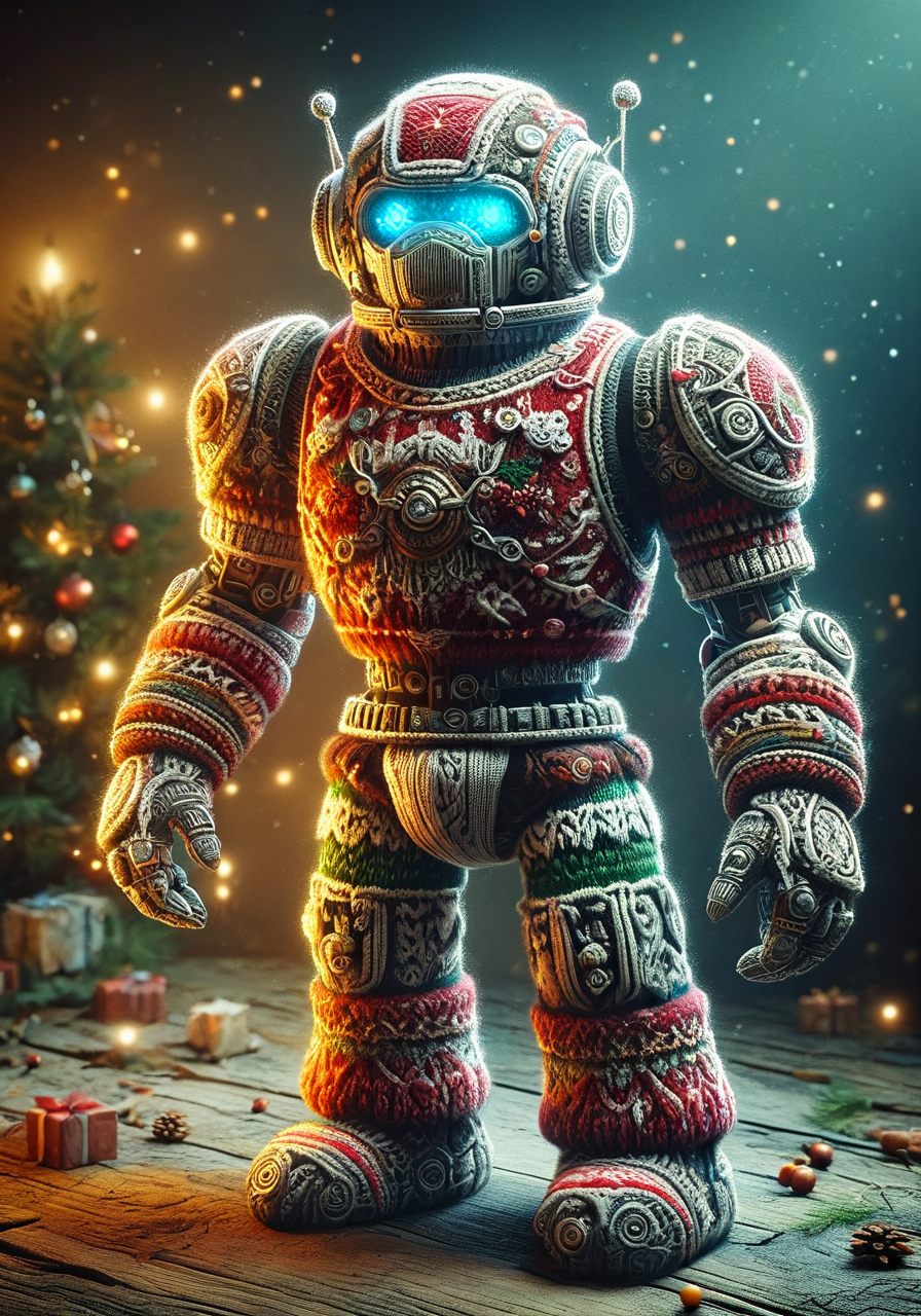 a made of ChristmasSweater (robot) with ChristmasSweater body in a high detailed fantasy ChristmasSweater world, Christmas themed, christmas tree. The lighting should be sweet, and the colors should be vibrant. , , ChristmasSweater<lora:- SDXL - vanta-black_contrast_V3.0.safetensors:0.1:0.1> <lora:SDXLChristmasSweater.safetensors:1.1:1.1> <lora:aidma-Image Upgrader-v0.1.safetensors:0.4:0.4> <lora:Fantasy with epic details - XL SDXL v1.0.safetensors:0.2:0.2>
