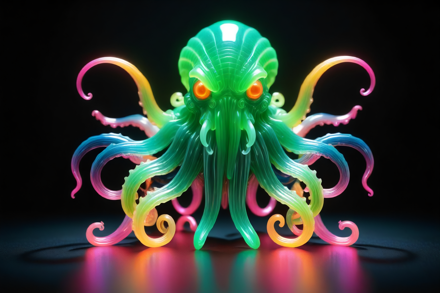 <lora:World_of_Glass_Filament:0.8>, w0gf1, Cthulhu made of tiny neon glass filaments,