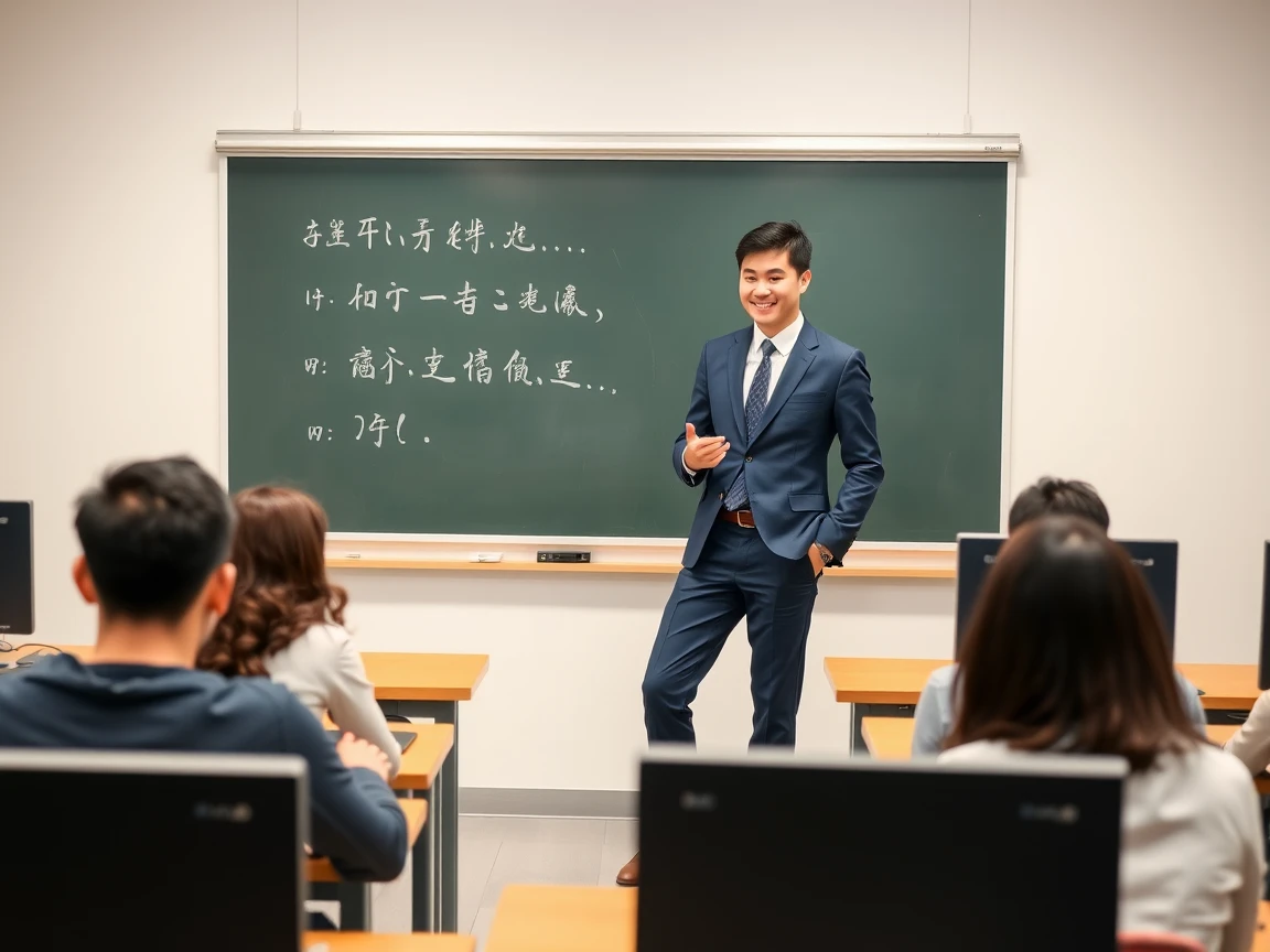 A photo of a young Chinese male teacher, teaching English, wearing a navy blue suit, trousers, tie and leather shoes, standing next to a blackboard in a modern classroom with some English words written on it, teaching a class to students sitting at desks using computers, smiling, this photo was taken with Nikon style.