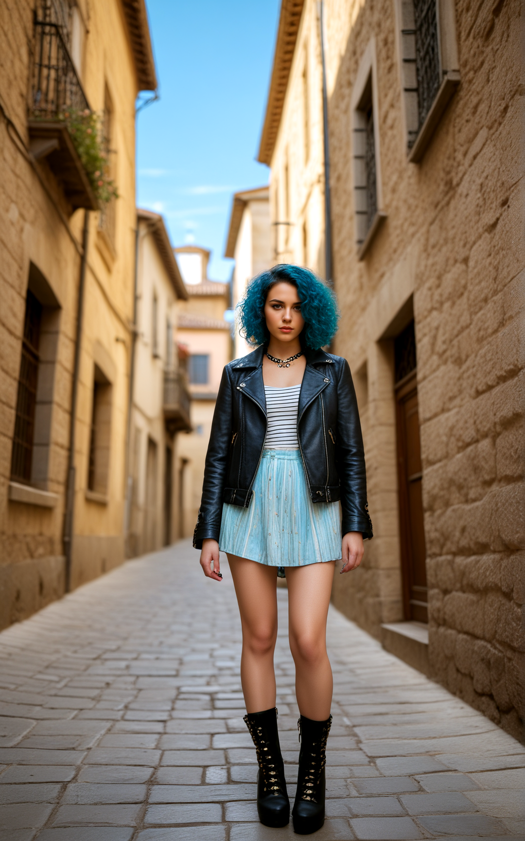 zPDXL3,(full body photo:1.4),(full body:1.4),(full shot:1.4),(full body shot:1.4),(from_back:1.4),(from behind:1.4),(back view:1.4) A 22 year old Woman,jade green eyes,nose piercing,medium length blue curly hairs,Curly Lob (Long Bob) cut, style,(sulking expression:1.3),(slender body:1,1),,flat chest,Dressed in powerful and varying colors gold and pastel blue dip dye Texture print (black leather jacket with studs on the collar, worn over a striped dress, paired with ripped tights and buckled ankle boots:1.2),A vibrant spring afternoon in the Jewish Quarter of Toledo, with blooming flowers adorning the ancient stone walls, sunlight filtering through narrow alleyways, and the intricate details of historic architecture highlighted, evoking a sense of renewal and beauty,