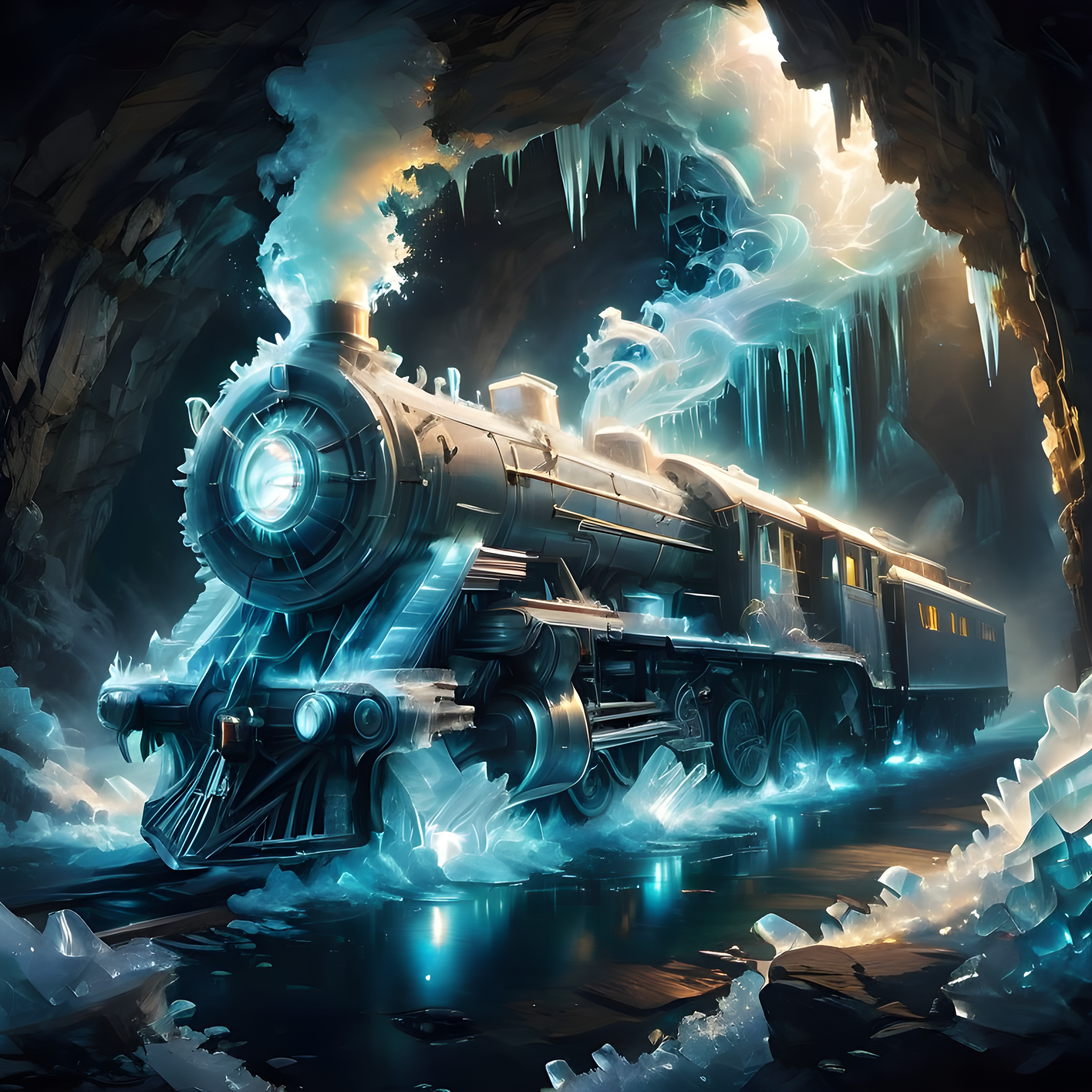 mad-ice (Steam train), translucent ice crystals, (icicles), ice gorge, ice explosion, bright light, Iridescent lighting, digital art style, epic, powerful