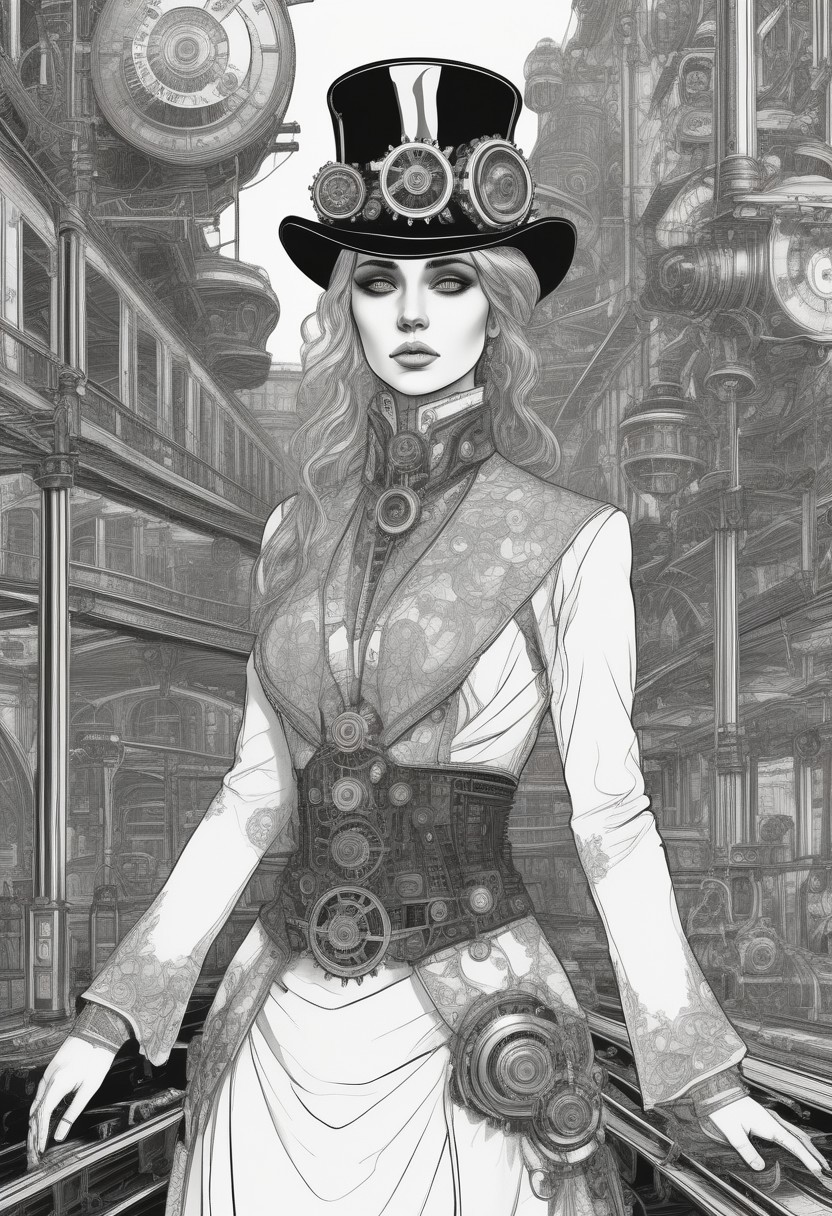 A captivating steampunk-inspired vector illustration of a striking blonde haired woman, dressed in a sophisticated manner, wearing a top hat and googlles. Her body is intricately detailed with cogs, gears, and pipes, reflecting the vintage sci-fi and retro-futuristic aesthetics. She boards a steampunk steam powered train with a city of BUdapesht. A minimalist white background accentuates the striking mechanical design, while her pose exudes a sense of adventure and intrigue. The image appeals to steampunk art aficionados and enthusiasts.