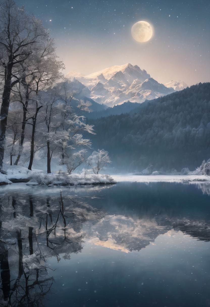 Winter scenery, winter lake, night sky, Stars shimmer brilliantly across the heavens, crescent moon silvery glow. quiet lake, tree on the shore of a lake, beautiful lake reflecting beautiful mountains, dappled sunlight, diamond dust, sunlight, blue sky, day, beautiful view, mysterious glow, beautiful clouds, depth of field, masterpiece, best quality, 8k, ultra-detailed, very aesthetic, superb composition, finest details, intricate details, absurdres, high contrast,