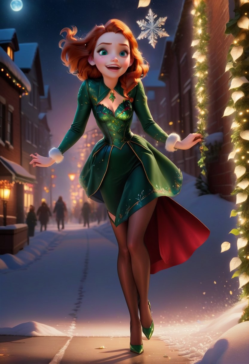 cinematic film still ((Masterpiece, best quality,edgQuality)), smiling,excited,score_9, score_8_up, score_7_up, score_6_up, 1 girl, poison ivy, beautiful eyes, big eyes, detailed eyes,snowflake ivy,snowflake,a sky full of twinkling stars, scattered luminous petals,Christmas street,falling snow,dynamic_angle,