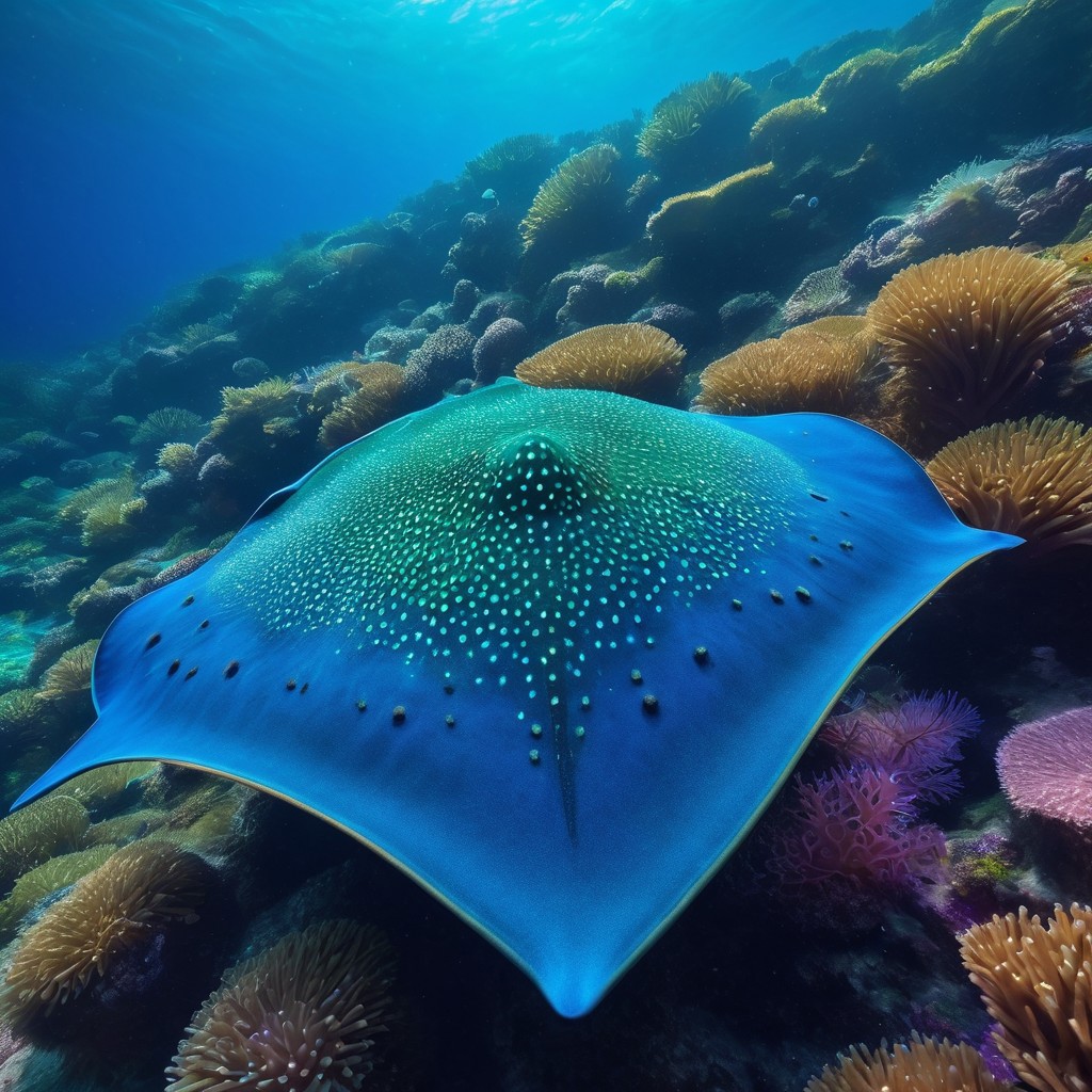 Focus on Stingray, Solo, No Humans, Animal focused, high contrast, stylized, dark, clear, surreal, ultra quality, 8k, best quality, masterpiece, seaurchin, Seaanemone, sandstone, oldstone, Stingray, radiant light, dappled light, Blue green light, A sting ray swims along the ocean floor while the majestic sea reef around it swarms with life, small fish swim to it's side and sea urchins and and sea anemone coat the floor in brilliant color and unnatural hues, Mystic snowflake patterns adorn the Stingray