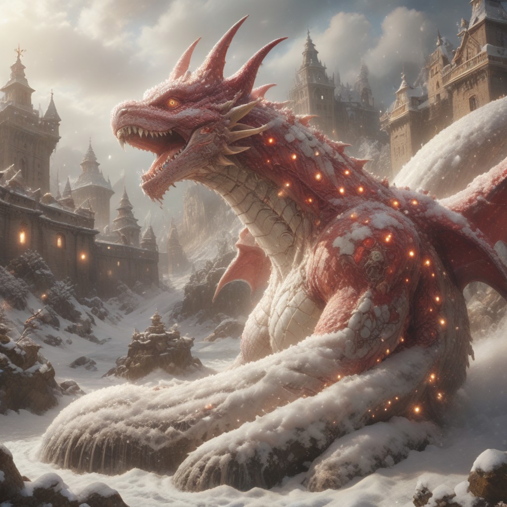 Create a high-resolution, professional product photo of a mythical creature, specifically a Dragon Queen of Tragic Endings, inspired by the art style of Hirohiko Araki (e.g., JoJo's Bizarre Adventure). The creature should be depicted in a triangular formation, front side view, atop a Fortress Whale, reminiscent of the 'dorohedoro' style. Incorporate elements of a high school mascot, particularly in the color scheme, which should predominantly feature red, brown, and white hues. The creature should have a robust, stocky body adorned with spike painting, evoking a sense of 'kawai' or Japanese cute aesthetics. Ensure the image is trending on Artforum and could be displayed as a museum item in Mexico.ChristmasWintery