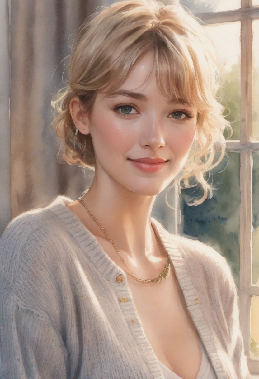 watercolor, watercolo style, breast focus, close up shot, , 1women, mature, solo, blonde hair, short hair, bangs, clear eyes, freckles, medium breasts, sweater, turtleneck sweater, nipple bulge, inside, warm light through the window, smile, looking at viewer, bracelet, noon, posing for photo, smile, posing