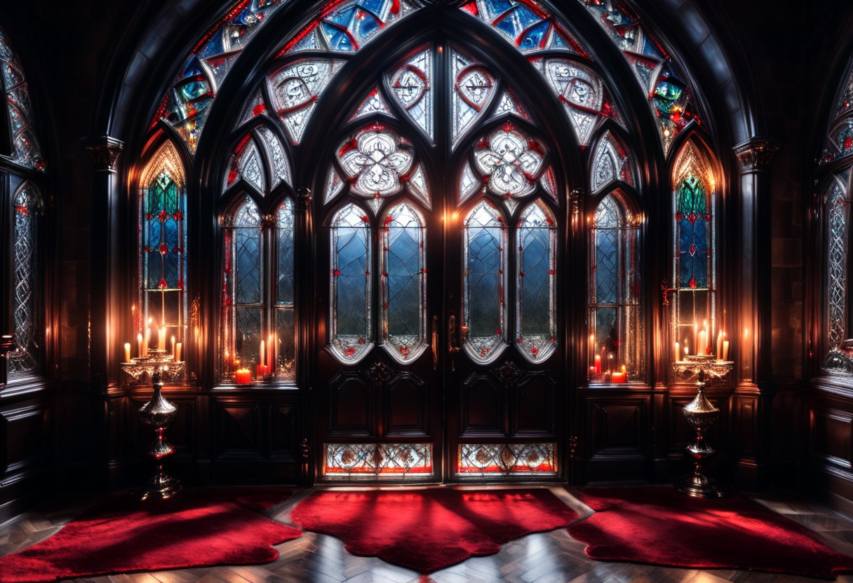 the recursion a fantasy stained glass doorway into a gothic mansion, Victorian arches, gothic, yule, christmas, gothic, high contrast 4k, sharp, very detailed, high resolution, ral-crztlgls, fireplace, red rug, candles, luxurious dark swirl