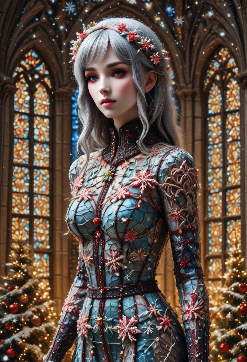 masterpiece, best quality, amazing quality, very aesthetic, absurdres, newest, volumetric lighting xmas_style_2K24, 1girl,solo,eye catching, drab A hyper realistic ultra detailed photo of beautiful girl, ultrarealistic, petite body, , Photorealistic, real photo, (ultra HD quality details), stained glass window, inside a gothic cathedral, flowers in the background, earrings, black choker, 1girl, solo, grey hair, very long hair, braid, medium breasts, tassel, blue eyes, bodystocking, gradient eyes, hip vent, shoulder cutout, seductive pose OverallDetail.,hair ornament,,christmas,snowing,snowflakes,christmas ornaments, lights.masterpiece, best quality, amazing quality, very aesthetic, absurdres, newest, volumetric lighting