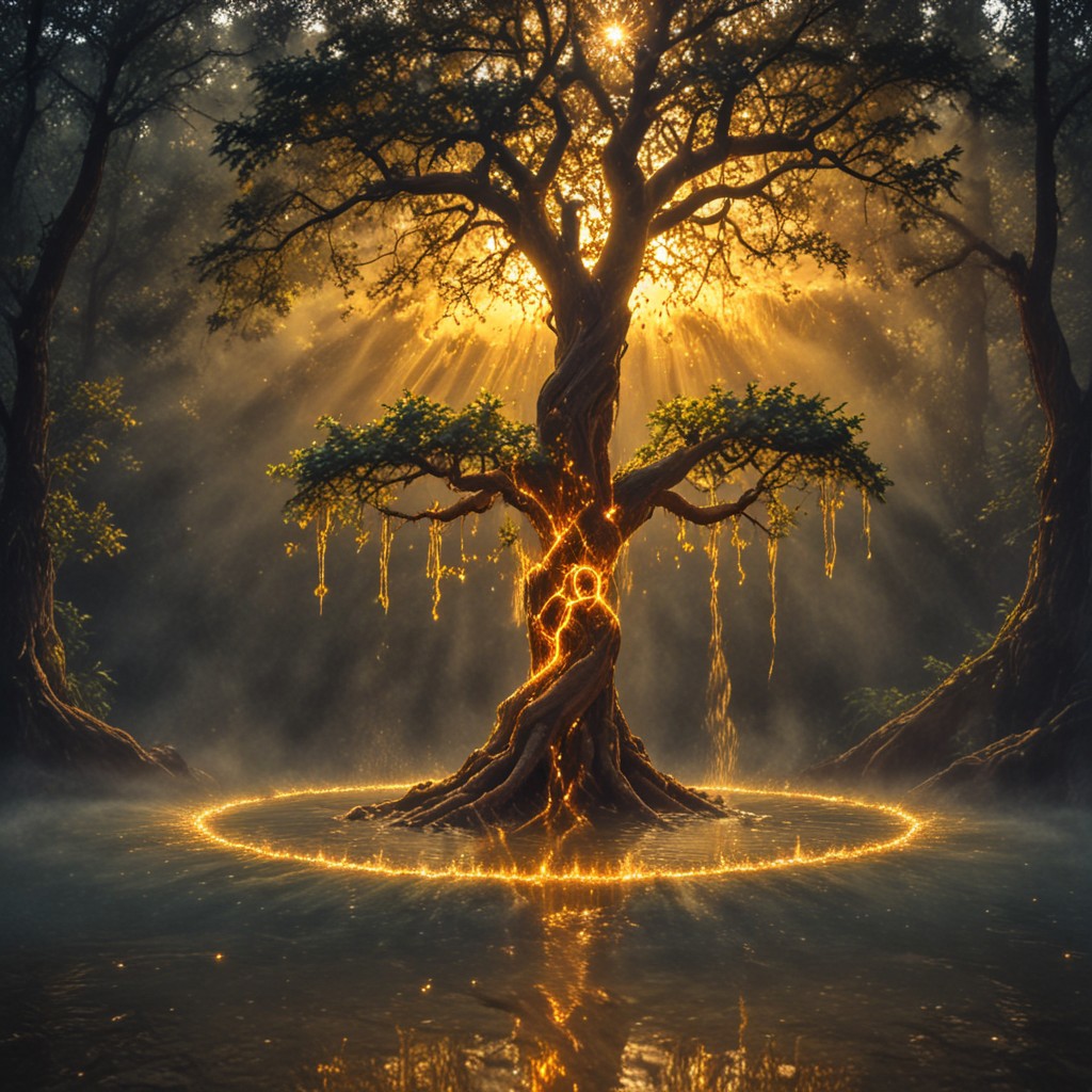 hyper detailed, water horizon, divine tree emerges from water, encircled tree, spiral , golden glow, golden lake, golden dust, sparkles, glitter midjourneyv6.1, nutcracker