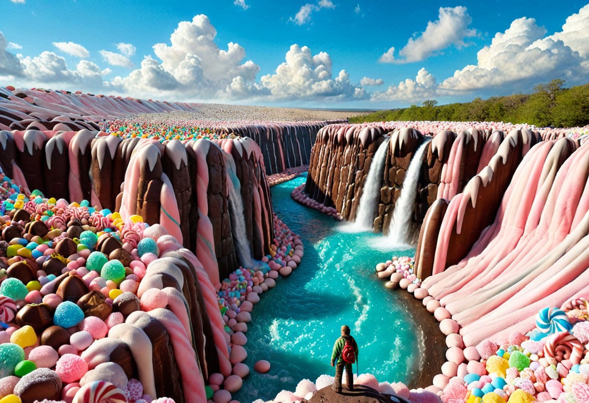 Score_9, score_8_up, score_7_up, score_6_up, absurdres, intricate details, BREAK, Lone traveler stands atop a ridge overlooking a valley of chocolate river flanked by banks of rock candy, 1man, from behind, looking away, facing away, wide shot, valley, candyfloss clouds, chocolate river, chocolate waterfall, chocolate rapids, candy shores, candy rocks, sugar canes, toffee cliff, coffee rift, BREAK, vally, wide shot, perfect lighting, epic, CHRC4ND7