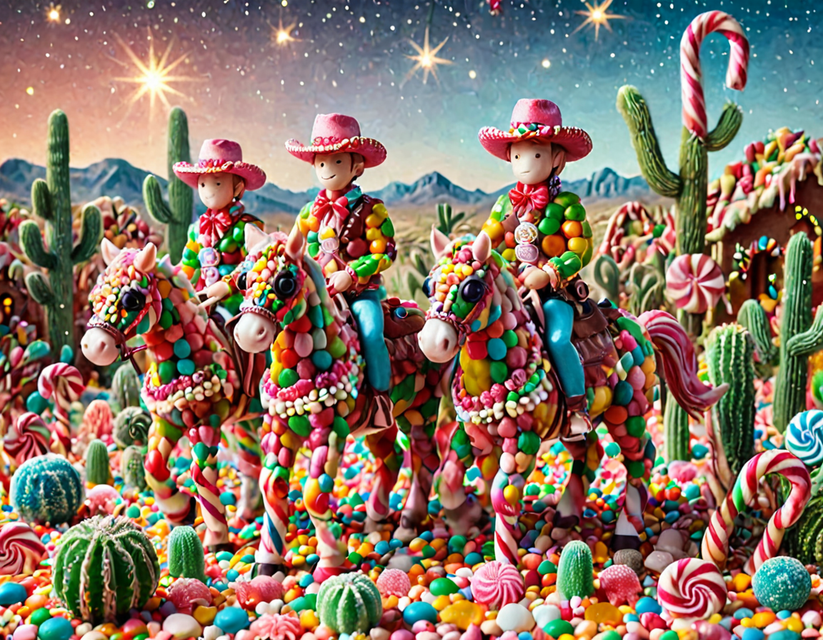 Candy cowboys riding candy horses in a candy desert with candy cacti , CHRC4ND7 <lora:Christmas_Candy:1>