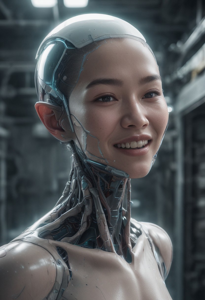 An Asian woman, KM_jade, smiles a huge smile, but she has the (body of an alien)++, (surreal)++, full body view, 8k, photorealism, photorealistic, ultra detailed
