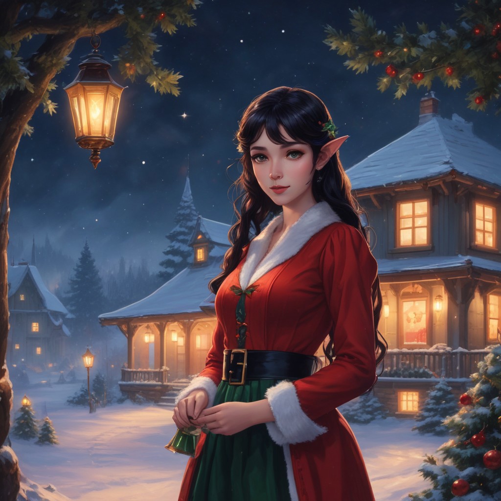 1 girl, elf holding a christmas bell, long black curly hair tied in two low ponytails, christmas decorations, stars, christmas dress, red dress, medium length dress, medium length sleeves, green and white striped tights, candy in her hair, pointed ears, delicate makeup, eyelashes, red lips, smile, green glowing eyes, winter, snow, outside, house with glowing windows, smoke from the chimney of the house, decorated house, night, crescent moon, red mountain ash trees covered with snow