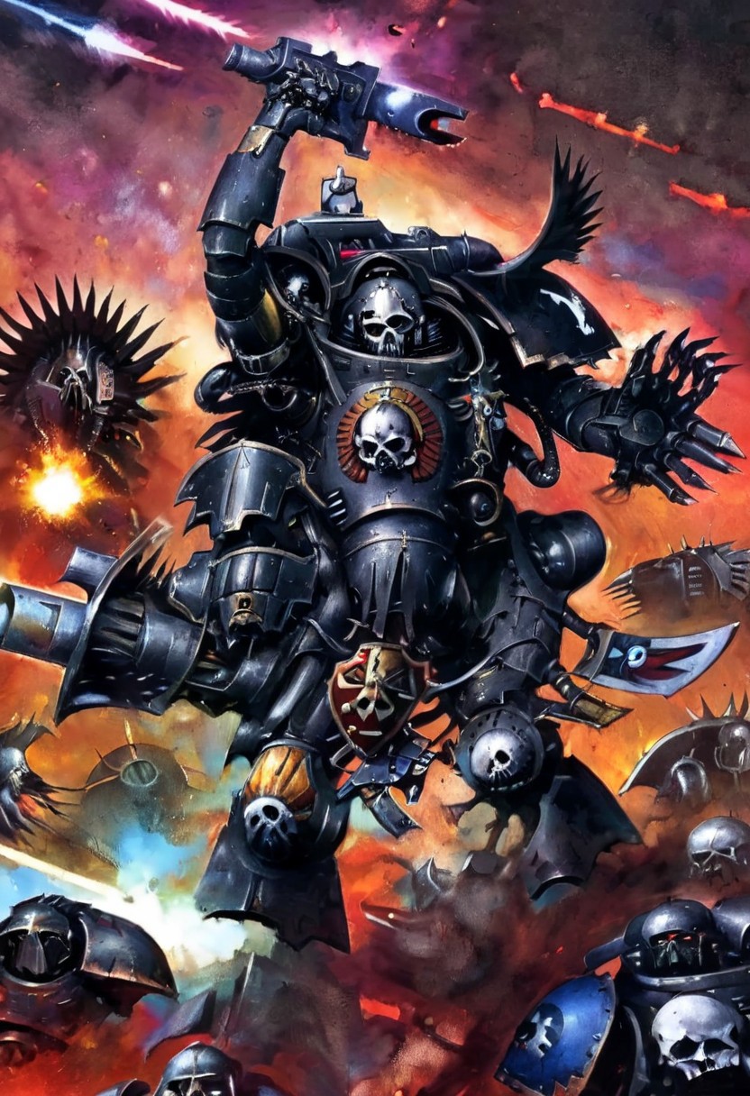<lora:fr4z3tt4:1>fr4z3tt4 scythe, mecha, robot, skull, black mech, solo, (illustration), Space Marine black power armor with grey helmet, blood stains chainsword in its right hand, action pose, charging into battle, upper body, vibrant colors, dynamic composition, dramatic, [[splash page]], expressive,extremely detailed, warhammer 40k, <lora:Astartes-000007:1>
