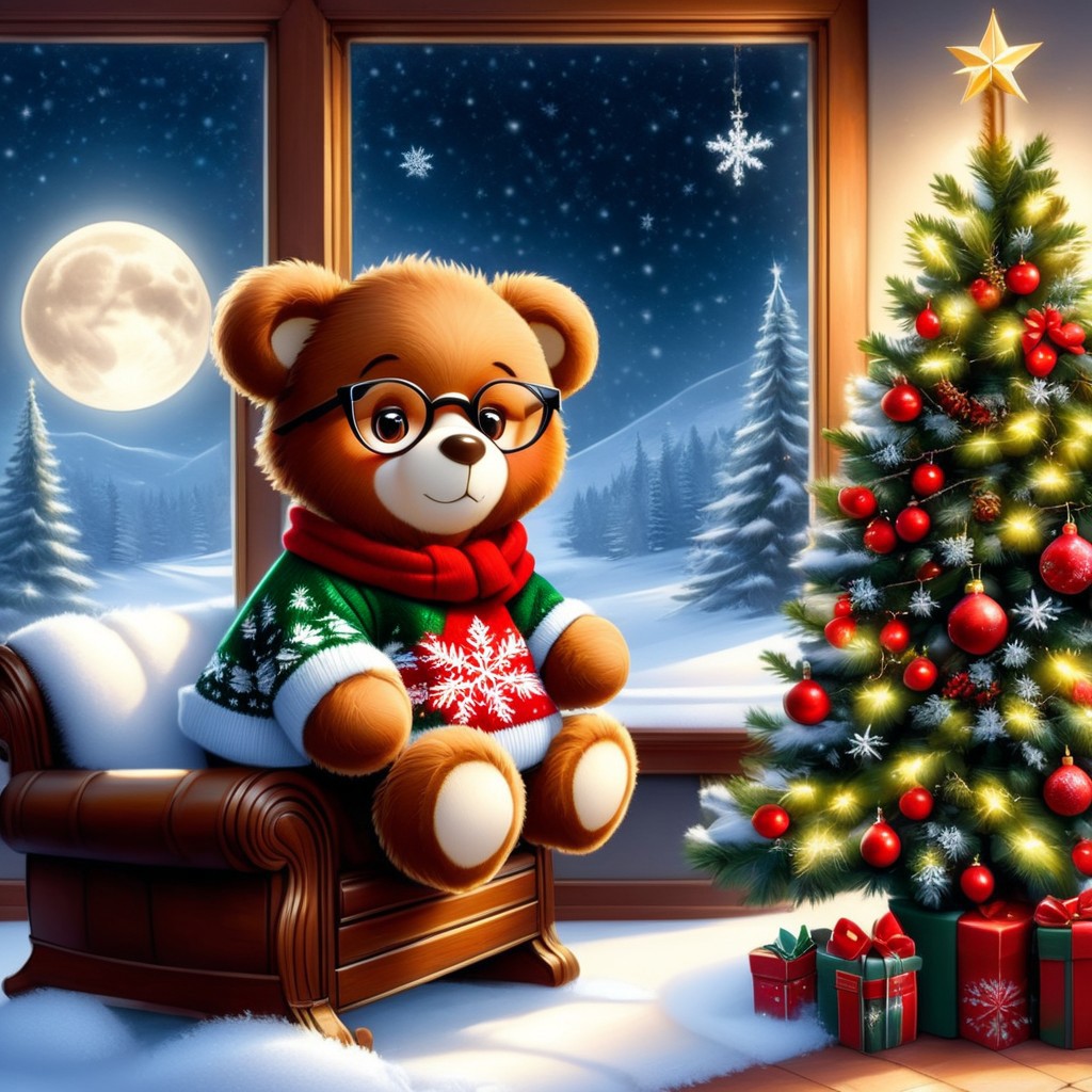 ( score_9, score_8_up, score_7_up, score_6_up, Masterpiece, Highly Detailed, 8k, Volumetric Lighting, Shadows, Proper Lighting Effects, xmastedx ) {{ Detailed Background ( scenery, indoors, living room, window ( full moon, stars, night, snow storm ), Christmas tree, Christmas ornaments, red carpet, fireplace, recliner ) }} 1girl solo ( Age 22, 163cm tall, shoulder length brown hair with red highlights, grey eyes, 38DD-28-38 measurements, wearing a christmas_sweater, wearing round glasses, wearing a red Christmas themed skirt, sitting on the recliner ) is holding teddy bear