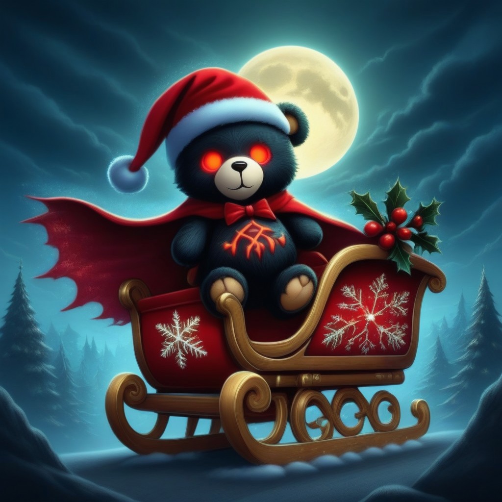 anime artwork <lora:Christmas-Rockin_teddies_sdxl1.0:1> xmastedx,Horror-themed an emo teddy bear wearing a Santa outfit and a santa hat, he has a flying christmas sleigh, glowing red eyes, tattered velvet cape, jagged toys, in the sleigh, stormy Christmas Eve, dark clouds, lightning, glowing moon, dramatic lighting, low-angle shot, eerie shadows, vibrant contrasts, gothic aesthetic, night sky . anime style, key visual, vibrant, studio anime, highly detailed