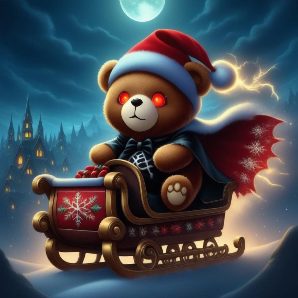 anime artwork <lora:Christmas-Rockin_teddies_sdxl1.0:1> xmastedx,Horror-themed an emo teddy bear wearing a Santa outfit and a santa hat, he has a flying christmas sleigh, glowing red eyes, tattered velvet cape, jagged toys, in the sleigh, stormy Christmas Eve, dark clouds, lightning, glowing moon, dramatic lighting, low-angle shot, eerie shadows, vibrant contrasts, gothic aesthetic, night sky . anime style, key visual, vibrant, studio anime, highly detailed