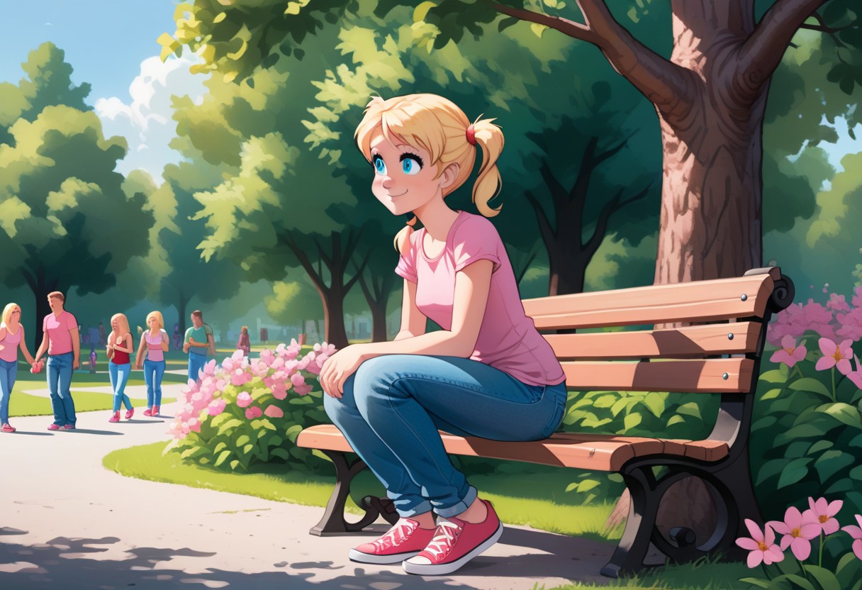 Score_7_up, score_8_up, score_9, score_6_up Outdoors, park, trees, flowers, day, summer 1girl, blue eyes, solo, Blonde pig tails, small breasts, short, young, petite, pink shirt, blue jeans, red shoes, break sitting on bench, 3/4 side view, happy