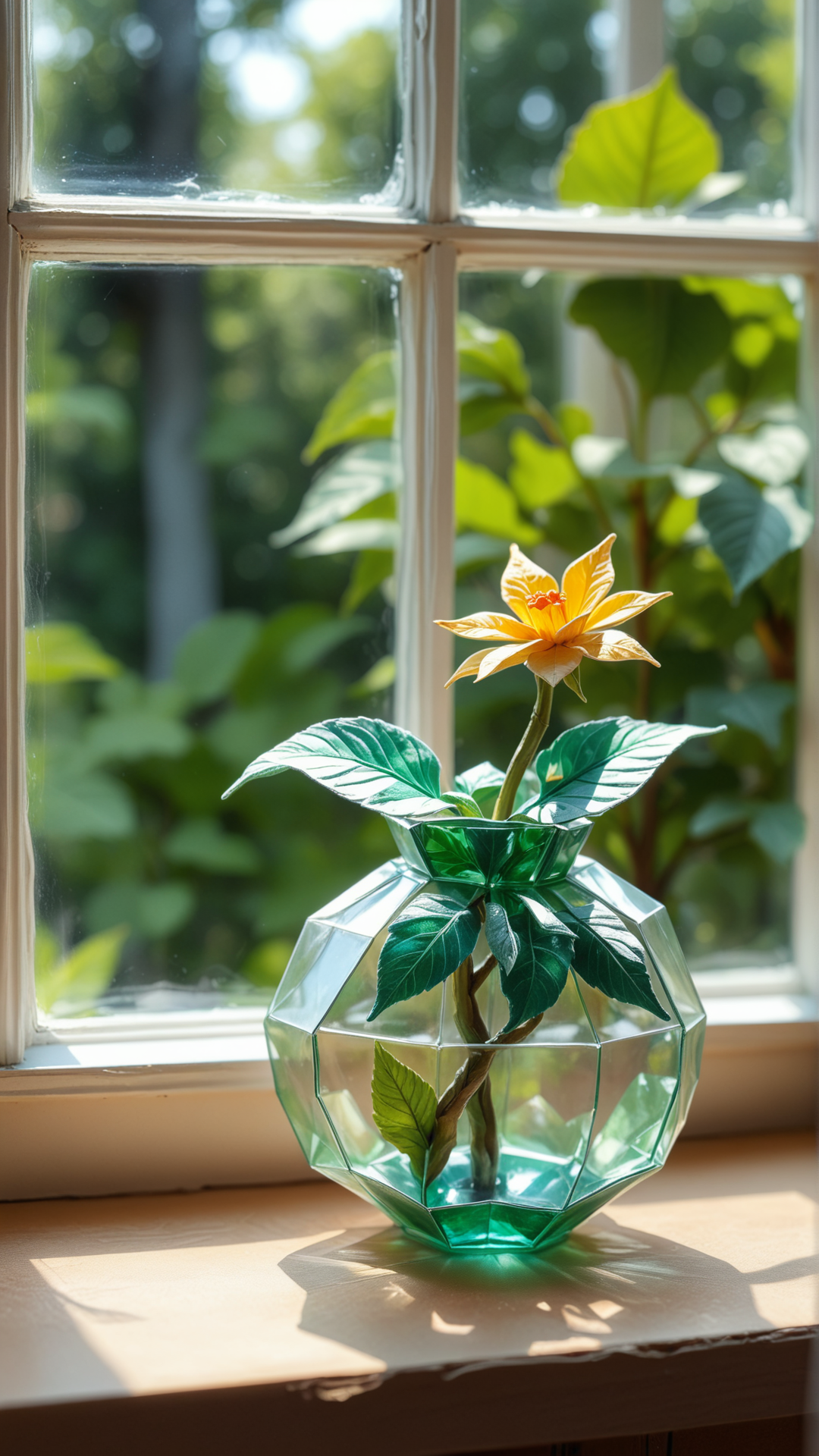 <lora:OrigamiStyleSDXL:1>OrigamiStyle Realistic, detailed, and delicate glass sculpture of a child's dreamy summer memories, placed on the edge of a windowsill, capturing the warm sunlight and casting colorful, distorted reflections, evoking nostalgia and fragility, with a blurred background of a lush green garden, painted in watercolors, capturing the essence of a distant, fond childhood memory.