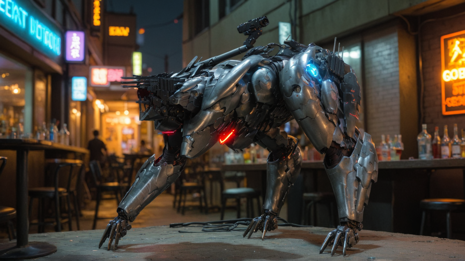 <lora:8ladeWo1fSDXL:1>A realistic photo of a 8ladewo1f, solo, no humans, robot, mecha, science fiction, non-humanoid robot, menacing, sniper tail, aggressive stance, dynamic camera angle, anime, night time cyberpunk city, neon glow, in location: A smoky, dimly lit cybernetic bar with robotic bartenders serving neon-colored drinks., detailed simple background, closeup