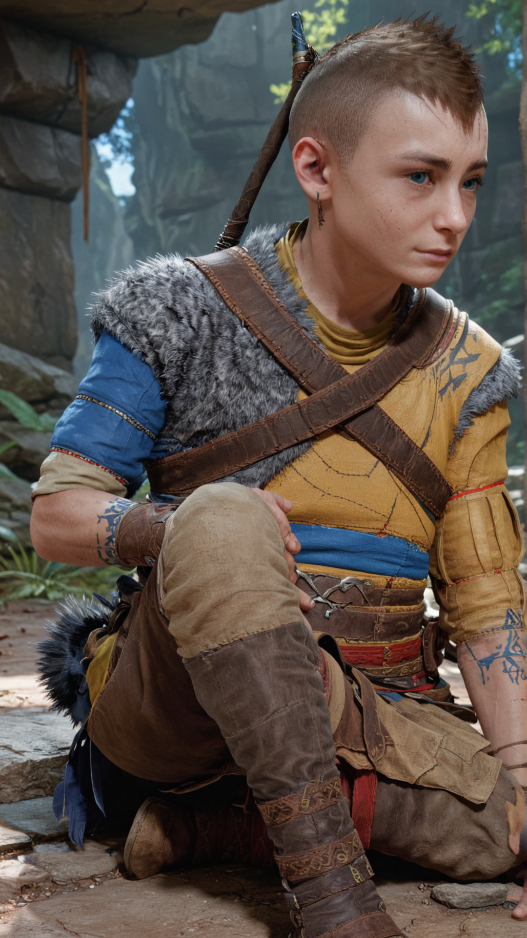 score_9, score_8_up, score_7_up, score_6_up, score_5_up, score_4_up, rating_safe, video game style, <lora:GoWRAtreusSDXL:1>GoWRAtreus, boy, (Sitting with legs bent and hands resting on ankles:1.5) in a kaleidoscope canyon location. Blue eyes and short brown buzzcut. GoWRAtreus is wearing a (yellow:0.5) tunic with leather details. Belts and straps crossing his body. (His waistcloth is red and blue:1.4). GoWRAtreus is wearing brown leather boots. His right arm is bare and has a tattoo. GoWRAtreus expression is Naughty, A mischievous grin, a wink, and a playful attitude..