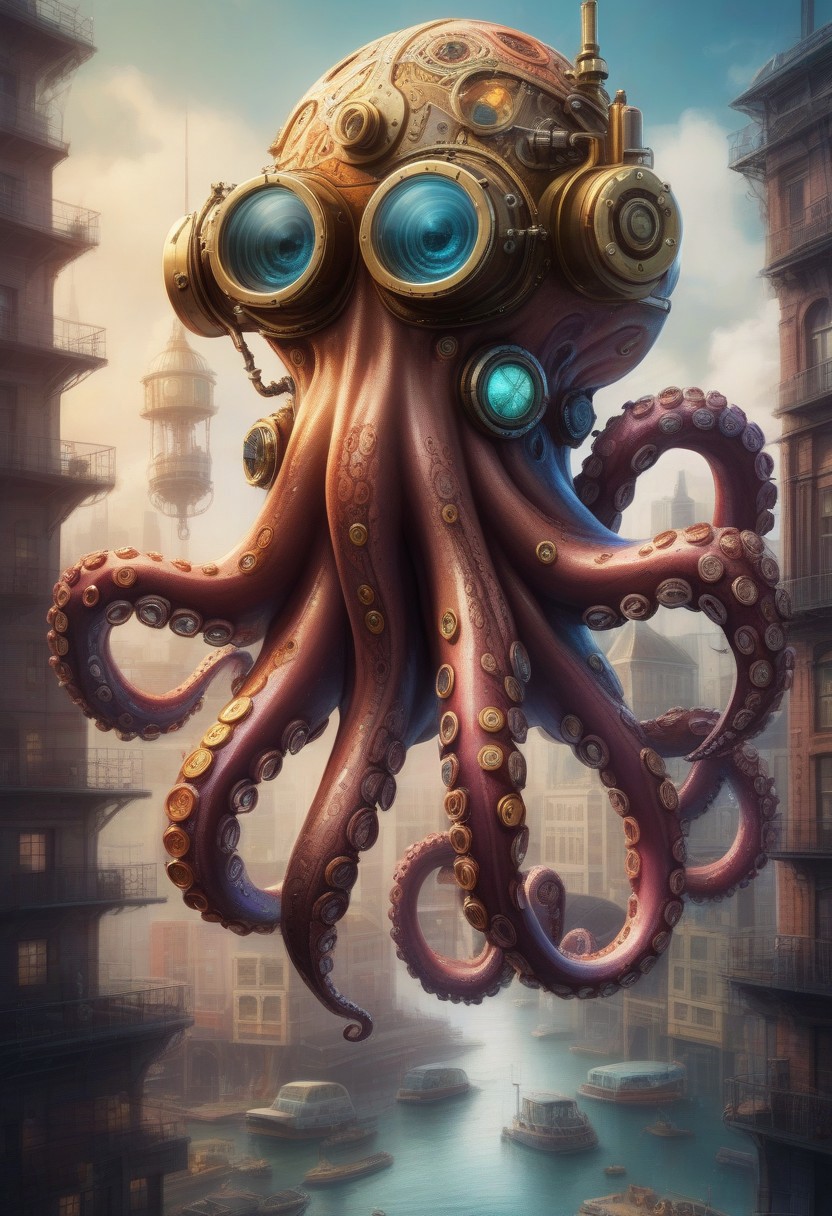 a heroic steampunk octopus with intricate mechanical limbs and brass fittings, wearing a stylish aviator cap and goggles, set against a backdrop of a fantastical steampunk cityscape. The octopus is striking a powerful pose, with gears and steam swirling around it, showcasing its adventurous spirit. The scene is filled with vibrant colors and detailed textures, highlighting the unique fusion of nature and machinery in a whimsical, imaginative world.