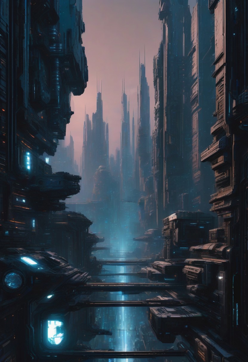 cyberpunk metallic cityscape. Large center, high tech, industy patterns, great black buildings, black colors, mechanic, highly detailed, futuristic, minimalist, blue lights
