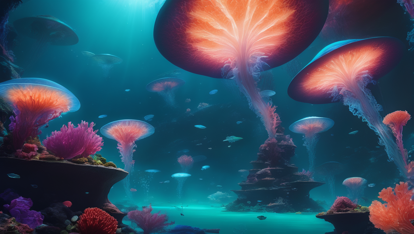An alien reef suspended in midair, with glowing coral-like structures reaching toward the stars. Floating, jellyfish-like creatures drift among the coral. ,masterpiece, best quality, amazing quality, very aesthetic, absurdres, scenery, official art
