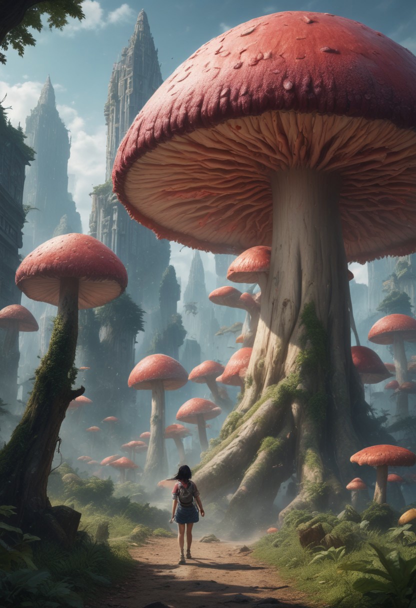 An Asian woman, KM_jade, runs away screaming from giant mushroom monsters chasing her, 8k, photorealism, photorealistic, ultra detailed