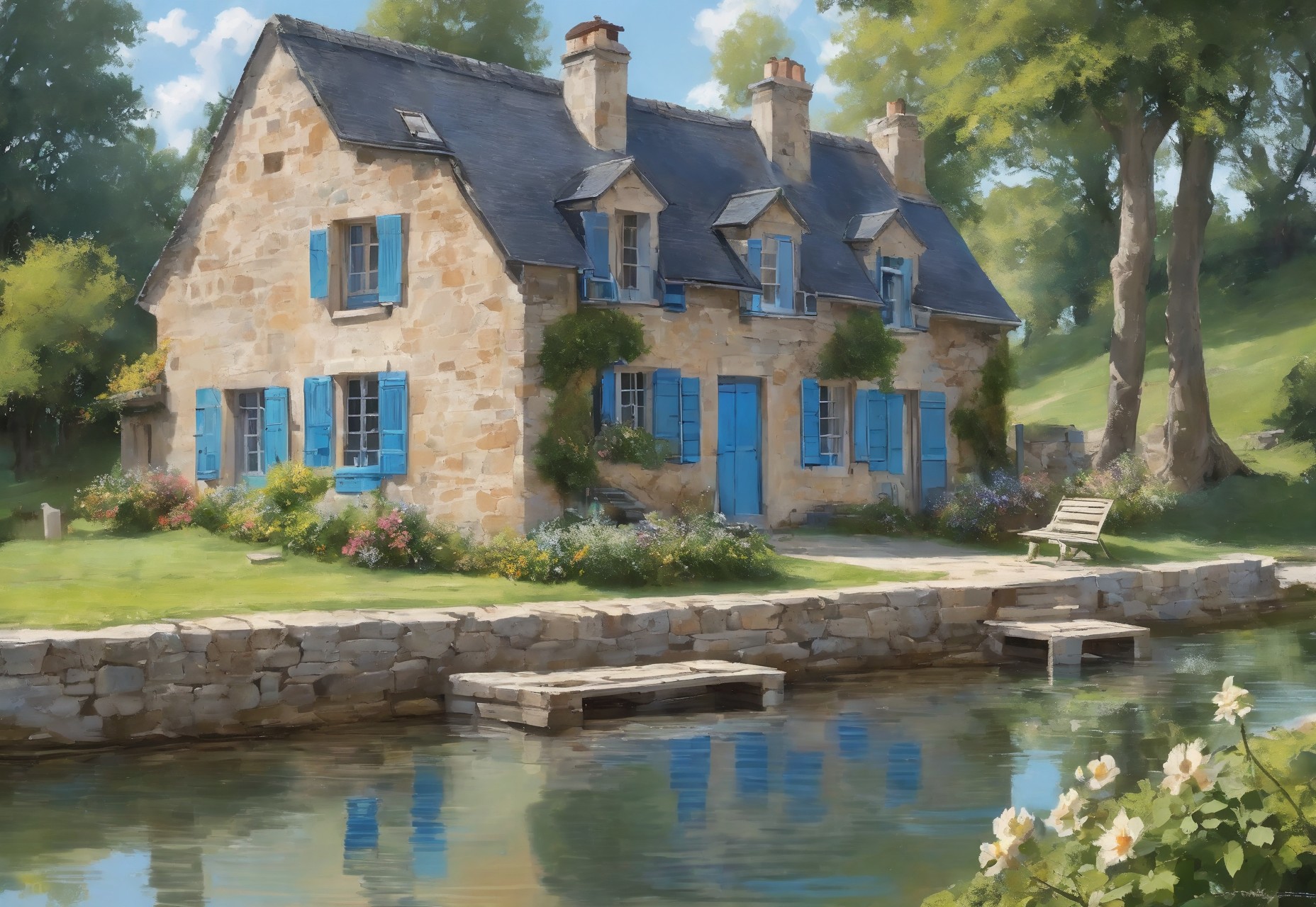A charming, cozy French stone cottage with golden-hued walls, complemented by blue or green shutters that add a splash of color. The house sits peacefully beside a serene lake or pond, with a small wooden pier extending over the water. The scene is set on a beautiful sunny day, with clear blue skies and soft sunlight bathing the landscape. Surrounding the cottage are lush green trees and vibrant flowers, adding to the idyllic and tranquil atmosphere. The reflection of the house and the pier shimmers on the still surface of the water, enhancing the picturesque setting