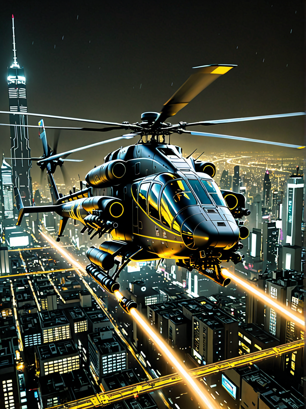 in the style of ck-mgs, A digital artwork in the style of cknc, a_skynet_cyberdyne_craft, the image is featuring a futuristic, highly advanced attack helicopter moving rapidly in the air above a cyberpunk city at night. The hull is made of a dark gunmetal alloy with rivets, bolts, glowing LEDs and diodes, and the helicopter has large guns mounted on the exterior; the cockpit shows glowing led lights, and has a large air intake, motion blur on the propellor blades (black with yellow highlights), two-man crew visible through the cockpit window