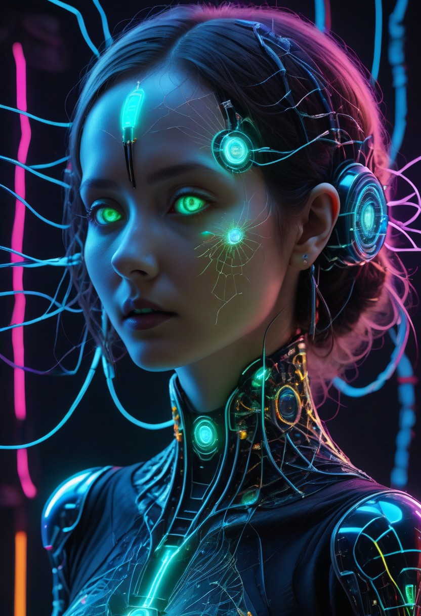 RAW Photo, a beautiful woman, cyberpunk fashion, mechanical eyes, wires, hyperdetailed photo, vivid vibrant colors, digital photography, very sharp details, neon lighting