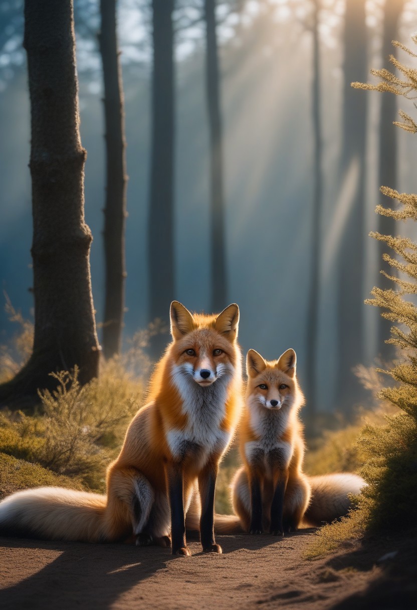 A mother and her fox are playing in the distance, day, blue sky, dynamic lighting, masterpiece, superb composition, finest details, highest aesthetics, strong muted highlighter, mystical glow, best quality, sharp focus, high contrast, colorful, ultra quality, 8k, best quality,