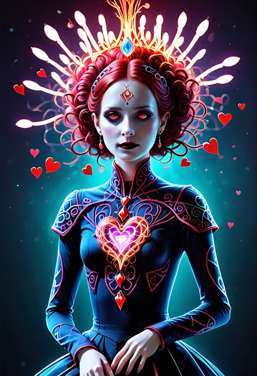 LudasStyle, score_9, score_8_up, score_7_up, Female, PG, Physical characteristics: Elegant facial features, pale skin, striking dark eyes, flowing red hair composed of heart shapes, full body, full body shot Clothing and accessories: Red, heart-shaped elements enveloping her body and head; intricate earrings visible, Position: Reclining or emerging from the playing card, with one hand extended gracefully, Background: Dark backdrop with smoky, ethereal effects, scattered red hearts and poker chips enhancing the thematic composition, Main element: Queen of Hearts playing card, creatively designed with a vivid, surreal touch, Art style: Hyper-realistic with fantasy elements, emphasizing red tones and a luxurious, dramatic atmosphere,