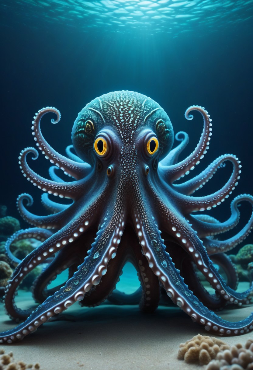 detailed, realistic, 8k uhd, high quality, masterpiece, An epic photo, crested octopus axanthic morph, full body, perfect eyes, extremely detailed,
