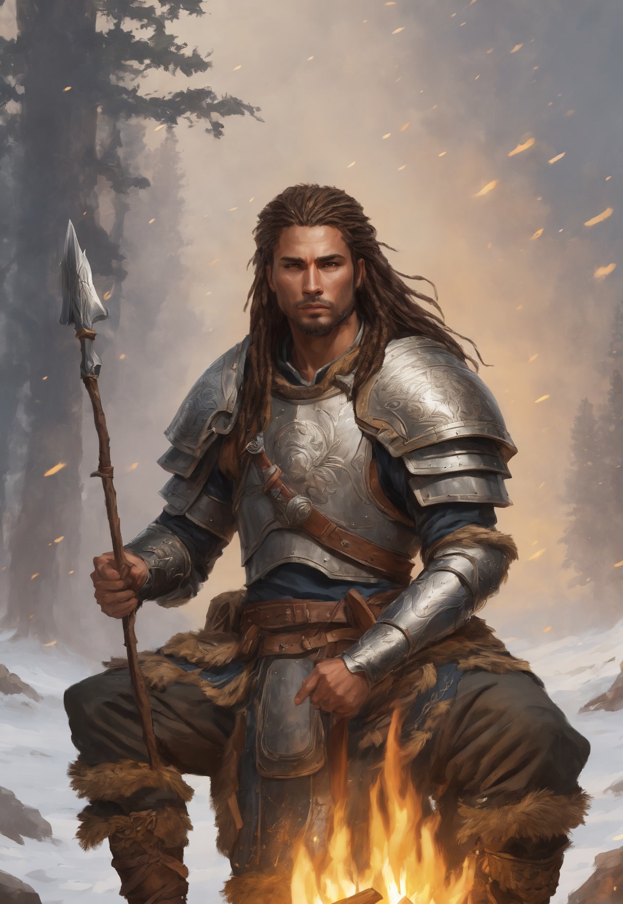 (highres lowres:1.07) (a warrior in armor with long hair , dreadlocks, wolf, campfire)