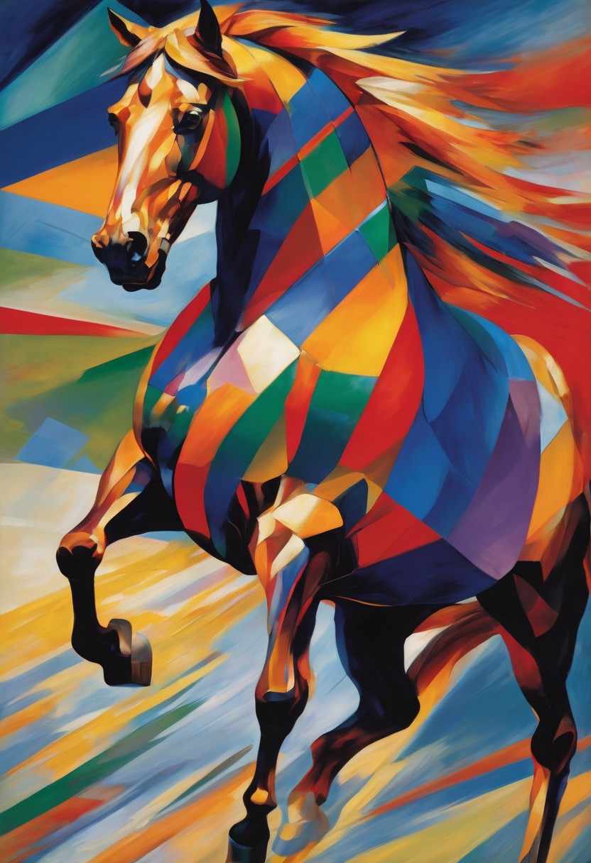 Dynamic, Futurist-inspired rendering of a speeding, abstracted horse, geometric shapes and kinetic, vibrant colors à la Umberto Boccioni