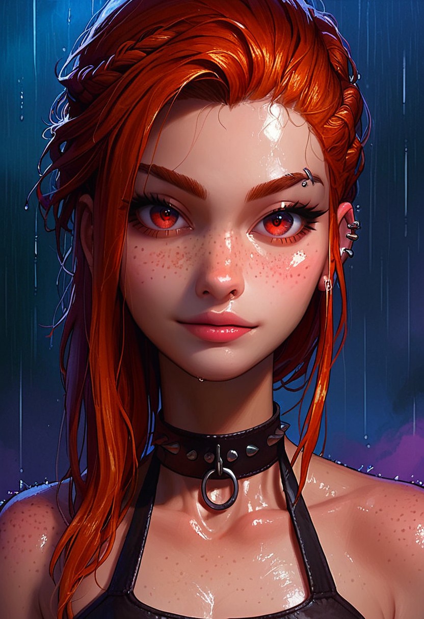score_9, score_8_up, score_7_up, source_anime, solo, 1girl, 21 year old, detailed face, jawline, collarbone, collar, lustful eyes, smooth skin, freckles, beautiful eyes, cloth choker, red eyes, redhead, straight combed hair, plunging neckline, straight hair, neon background, raining, moonlight, close up, french braid, looking at viewer, piercings, crop top, toned abs,