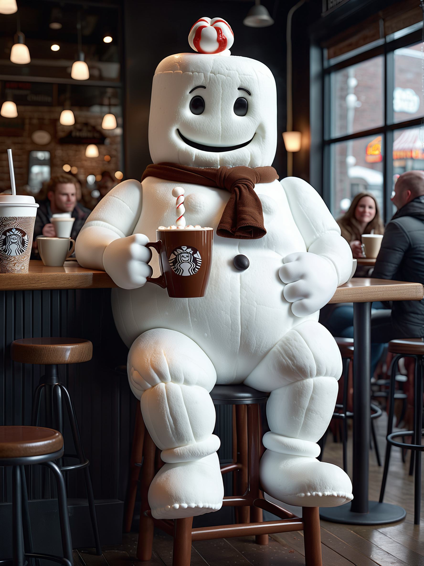 A (giant)++ marshmallow man sits on a stool inside a crowded coffee shop drinking hot chocolate on a cold dreary day.