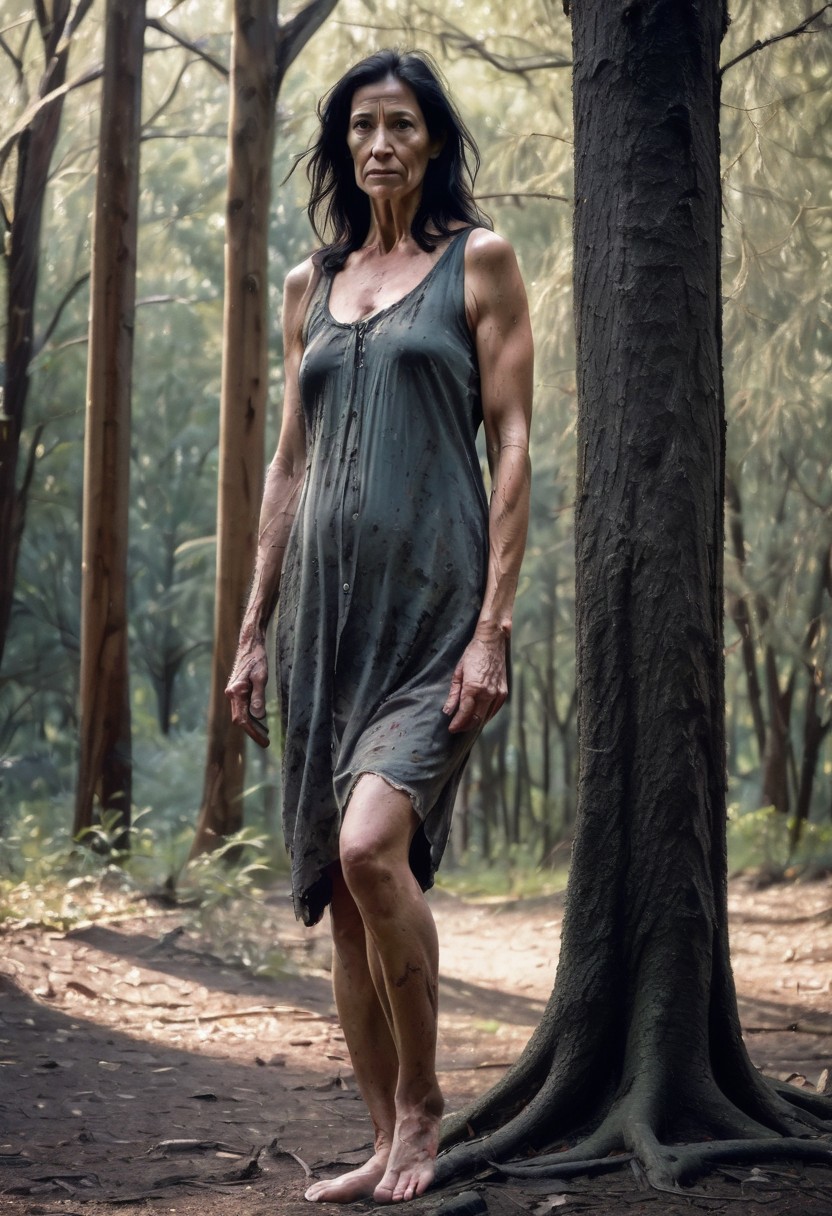 Tall, thin, very muscular, ugly, 40 year old woman. Long, unkempt dark hair. Tattered dress. Bare feet. Dirt smudges. Hands on hips. Standing in forest. Head tilted. Looking at viewer. Legs spread. Hand on hip. Inquisitive look. Morning light streaming through trees. Gum trees.