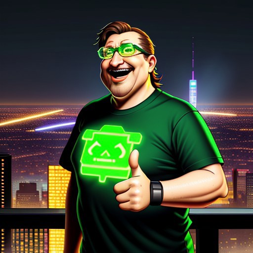 Cyberpunk Gabe Newell, bright green text on shirt says, "G Money", laughing, steam summer sale, hacker, Gaben has all your money, glowing green dollar sign for eyes, greed, holding money in his hand, futuristic, sci-fi, glowing green mechanical glove, cityscape, rooftop, luxury suite, thumbs up, cyberpunk, cyberpunk art, perfect light,