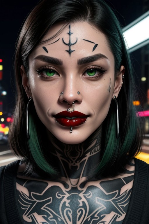 1woman:Raven(titans), close-up, portrait, 63 years old female, athletic, muscular, six-pack abs, large biceps, posing, cyberpunk style, face tattoos, covered in black tattoos, Ruby lipstick, insane, crazy, evil appearance, very pale, adult woman, cute face, brown-green eyes, full red lips, subtle smile, human features only, nighttime, stood on a busy street in a futuristic city, high quality, high definition, realistic skin, realistic eyes, realistic lighting, visible skin imperfections, visible pores and lines, visible wrinkles, visible blemishes, view from below, accurate perspective, hyper realistic, lip piercings, septum ring, eyebrow piercings, nostril piercings, dimple piercings, philtrum piercing,