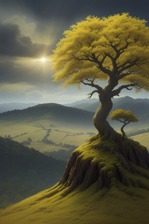Large, gnarled, barren tree, (detailed trunk texture: 1.2), centered in frame, against Sun , (blazing sunlight: 1.1), light, moody morning sky, landscape centered on a small hill, fantasy style, light tone, dramatic lighting, (bright light, slightly elevated perspective, photorealistic style, digital art, bright yellows, deep blacks, green landscape; (detailed branches:1.1), slightly out of focus, sundominating upper portion of image, white tree, fantasy tree, green hill, epic