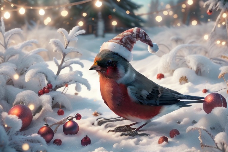 A happy cute, (robin:1.2), (bird), (wearing a Christmas hat), Adorable, heart warming, cheerful, detailed, bright colours, friendly expression, small size, shiny, eco-friendly, garden, winter, Christmas, environmental, sunlight, shadows, digital art, whimsical, playful, intricate details, high resolution, photorealistic, joyful atmosphere, gentle, soft lighting, cartoonish style, enchanting, vivid, appealing, character design, imaginative, family-friendly, [photography, realistic, photorealistic, (8k), (highly detailed), cinematic lighting, intricate details, (high resolution), award-winning, correct focus, realistic, realistic lighting, (highly detailed), masterpiece], ((Cinematic Still-Shot)), Chr457m45m3rg3D0nMN3M1C neon,