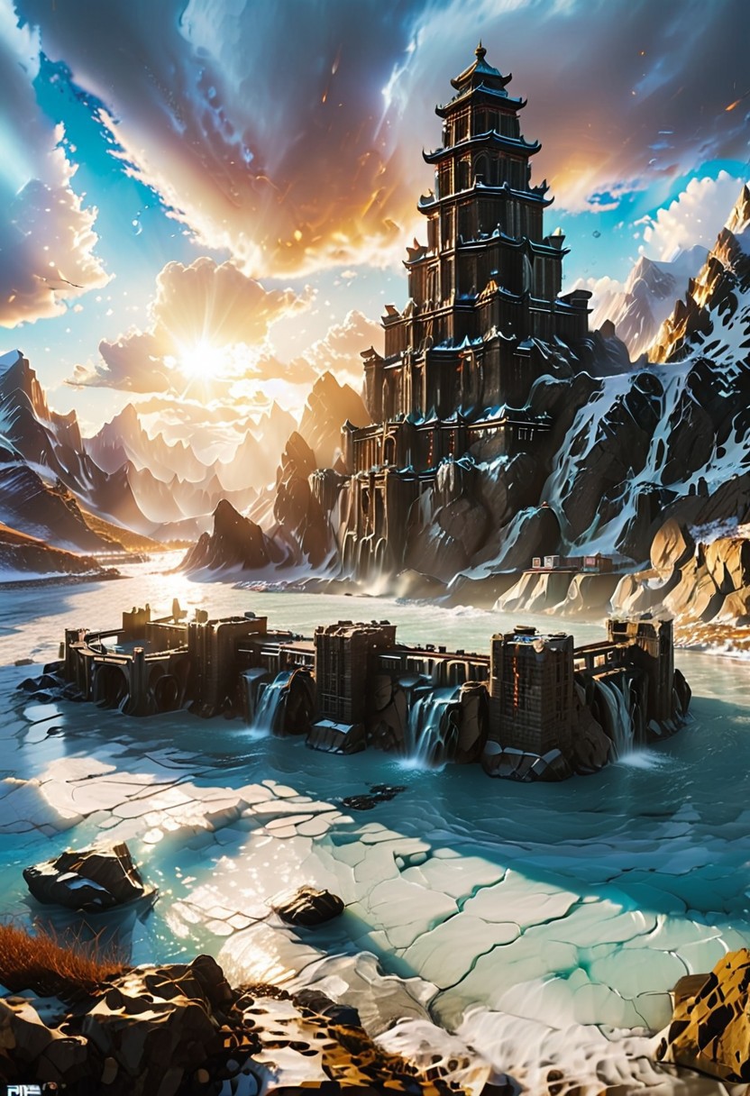 (ultra high res:1.4), (masterpiece), (beautiful lighting:1.4) , Great Mountains and river river, icy water water, mongolian scenery, mountain scenery , sunlight illuminates the icy water, anime, urithiru, tower city stands in the distance,, (clear underwater), beautiful sky with clouds, depth